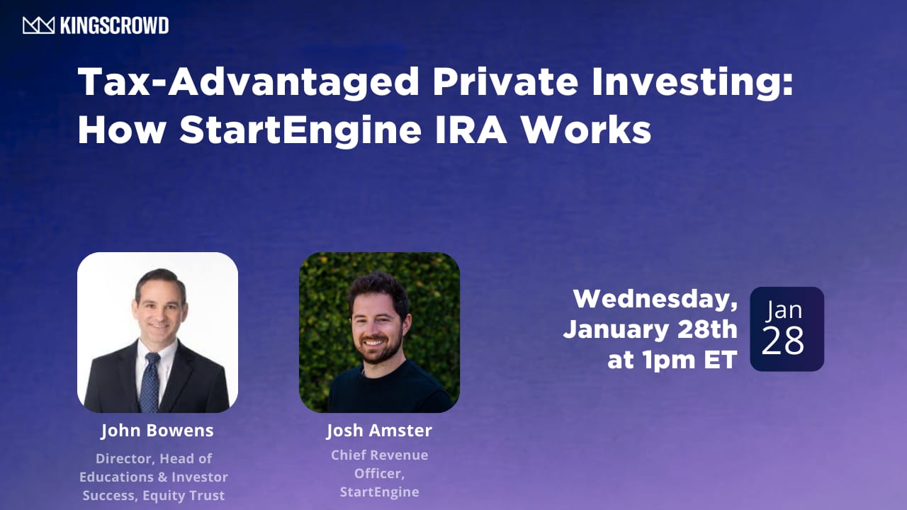 StartEngine IRA 101 Join us Wed, Jan 28 at 1pm ET for a free webinar with StartEngine and Equity Trust on how to use a self-directed IRA to access private-market opportunities. We’ll cover IRA setup/rollovers, portfolio allocation basics, and how pre-IPO investing can work with retirement dollars—plus live Q&A. |
