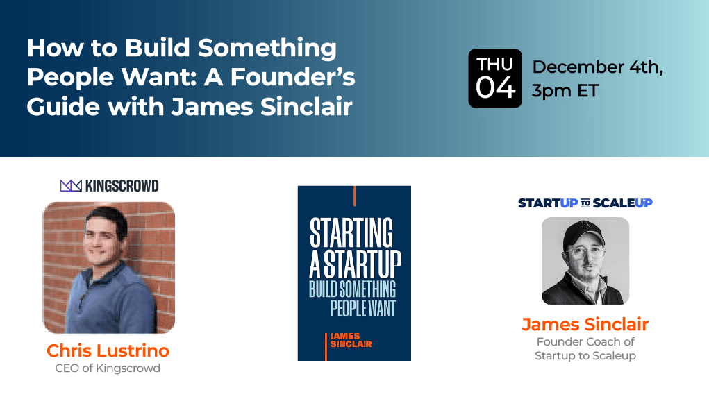 Today at 3pm ET, join serial entrepreneur and founder coach James Sinclair for a live, tactical workshop on validating your idea, designing an MVP, and getting your first paying customers—based on the frameworks from his new book Starting a Startup: Build Something People Want. Live attendees will have the chance to win 1 of 10 copies of the book plus a 1:1 coaching session with James, so this is one session you’ll want to show up to in real time.